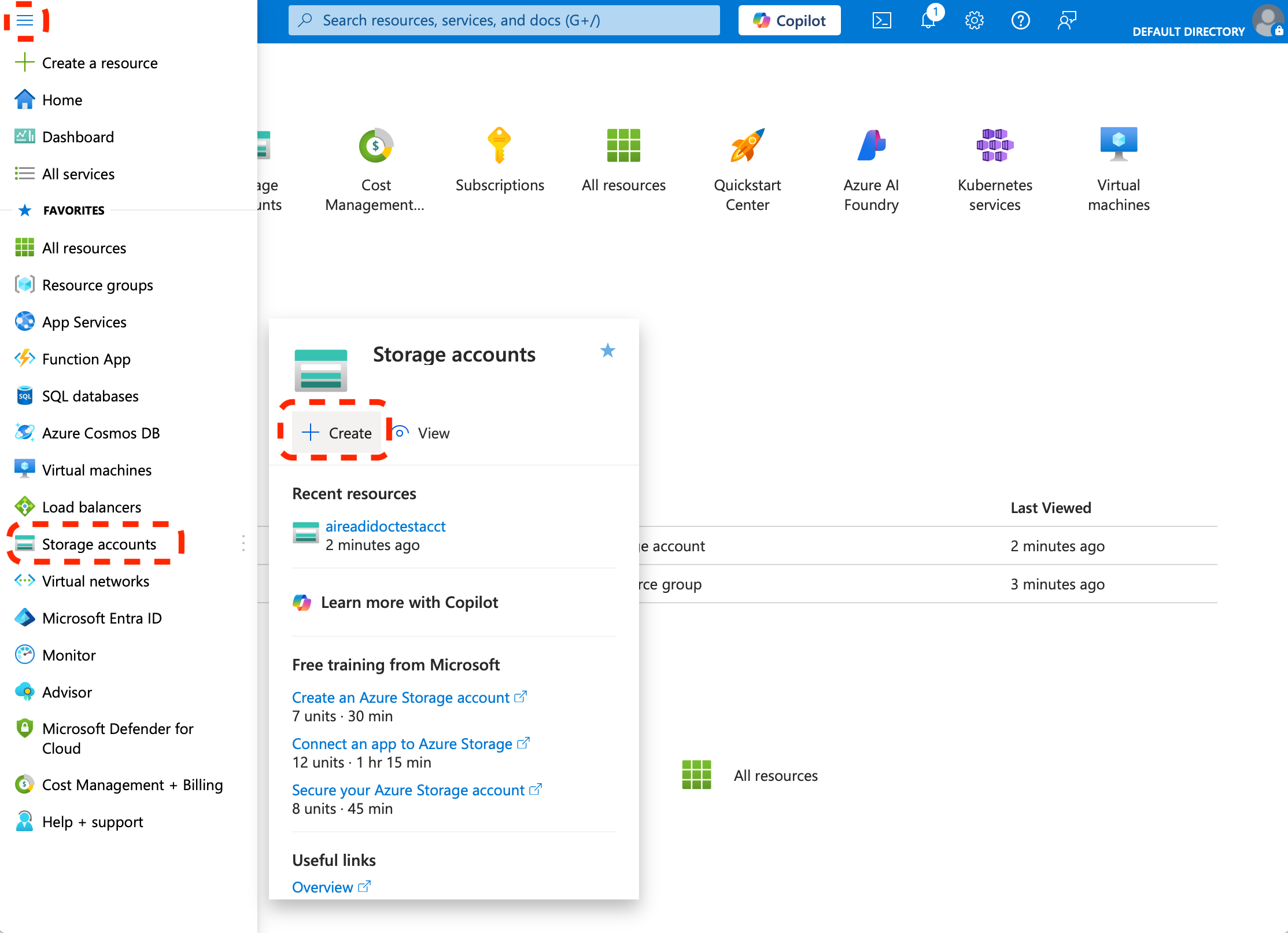 - Search for "Storage accounts" in the top search bar and click "+ Create".
