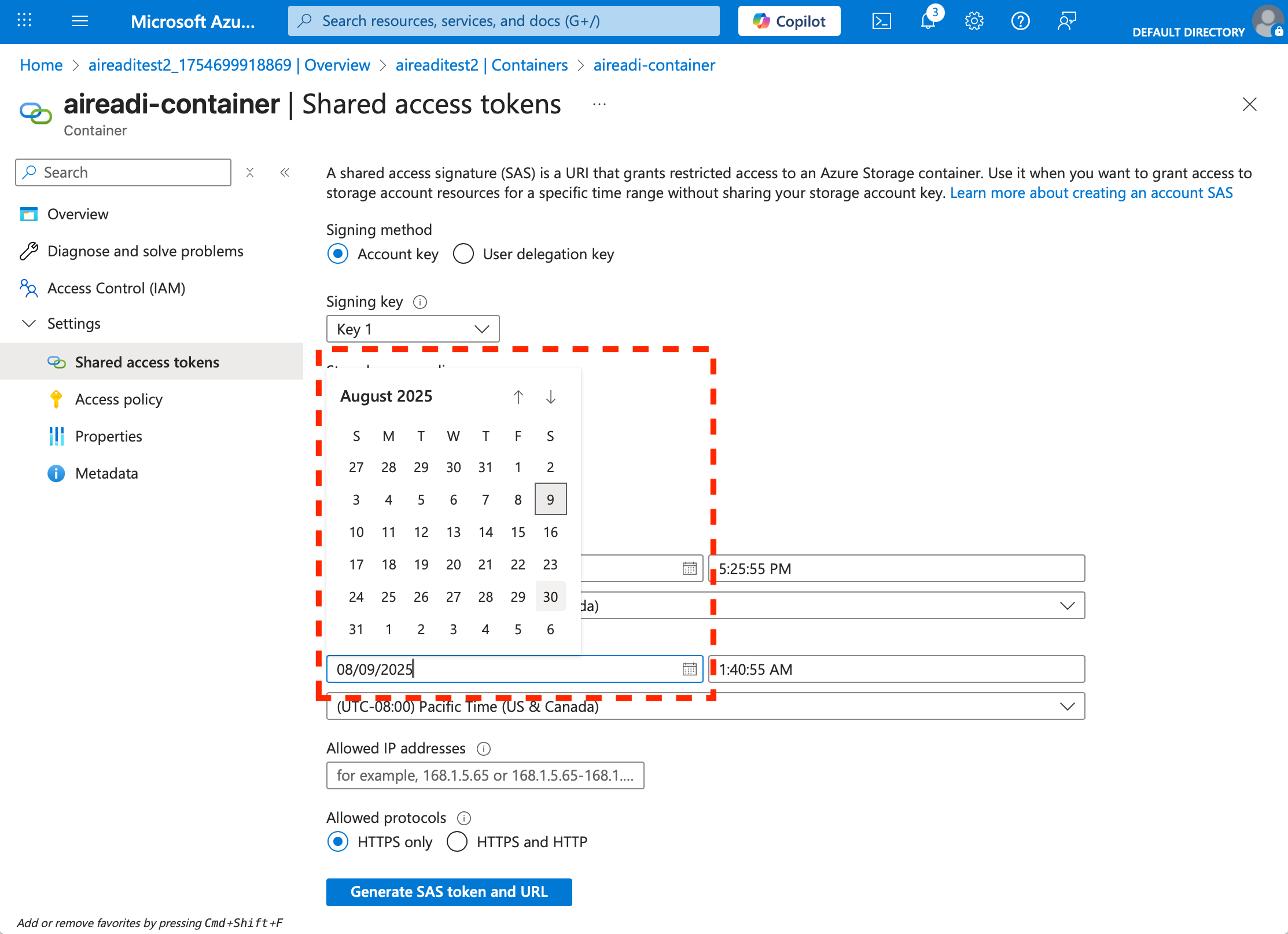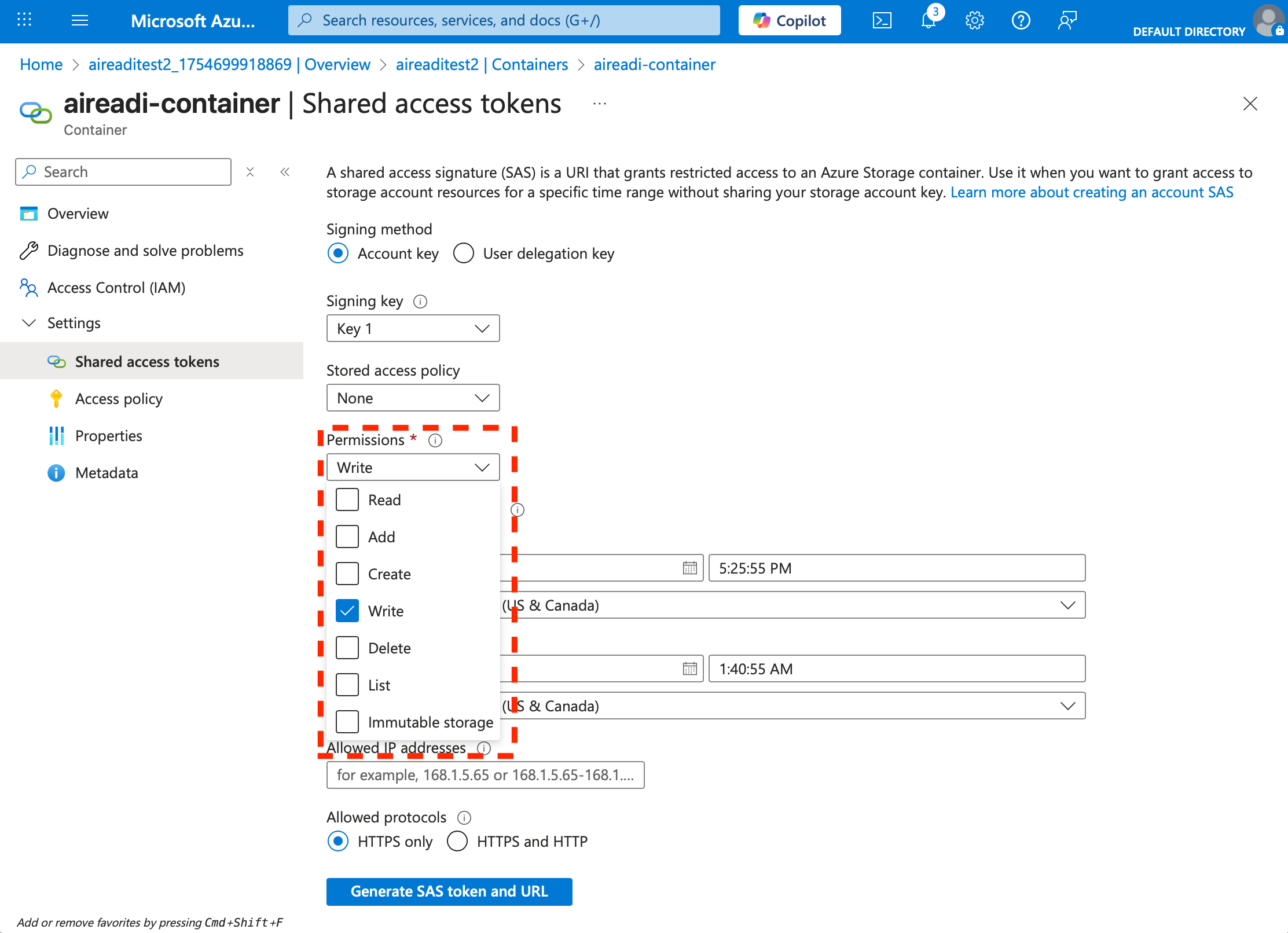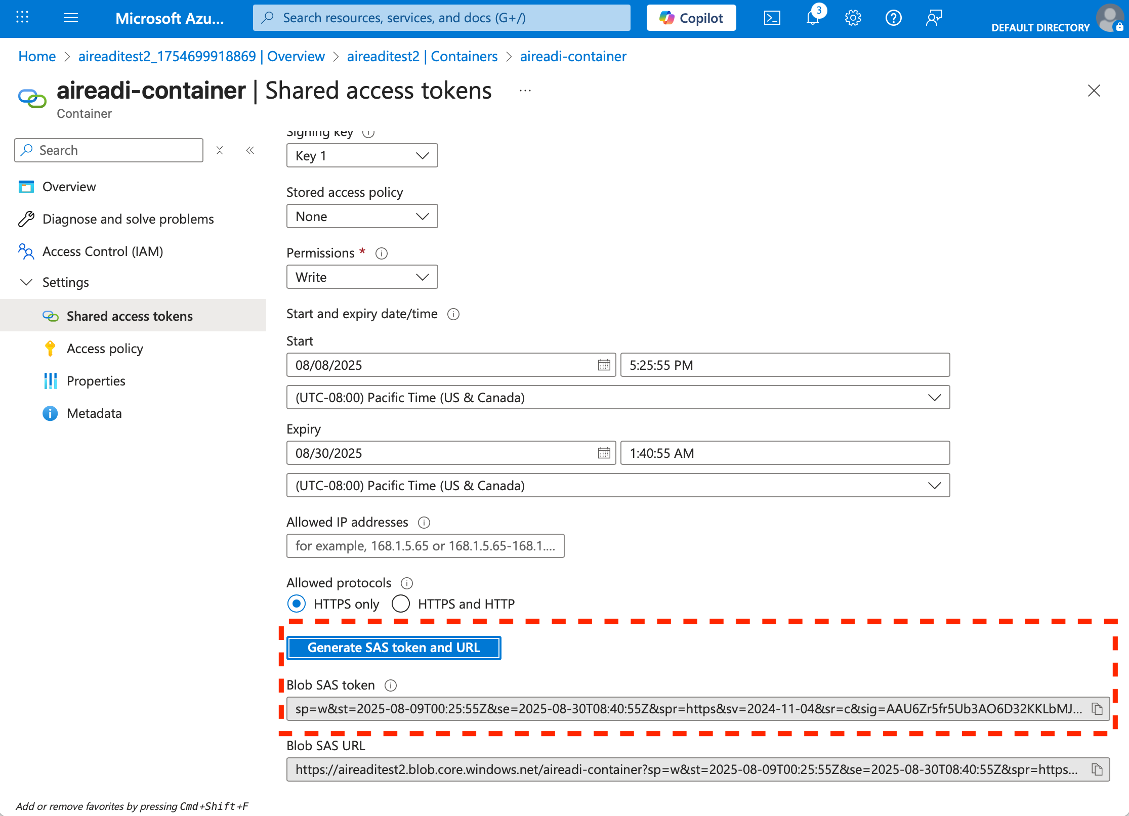 Now that we have a Storage Account and a Blob Container, create a Shared Access Signature (SAS) token. This token will allow the AI-READI pipeline to write files to your container. See the Microsoft documentation for more details.