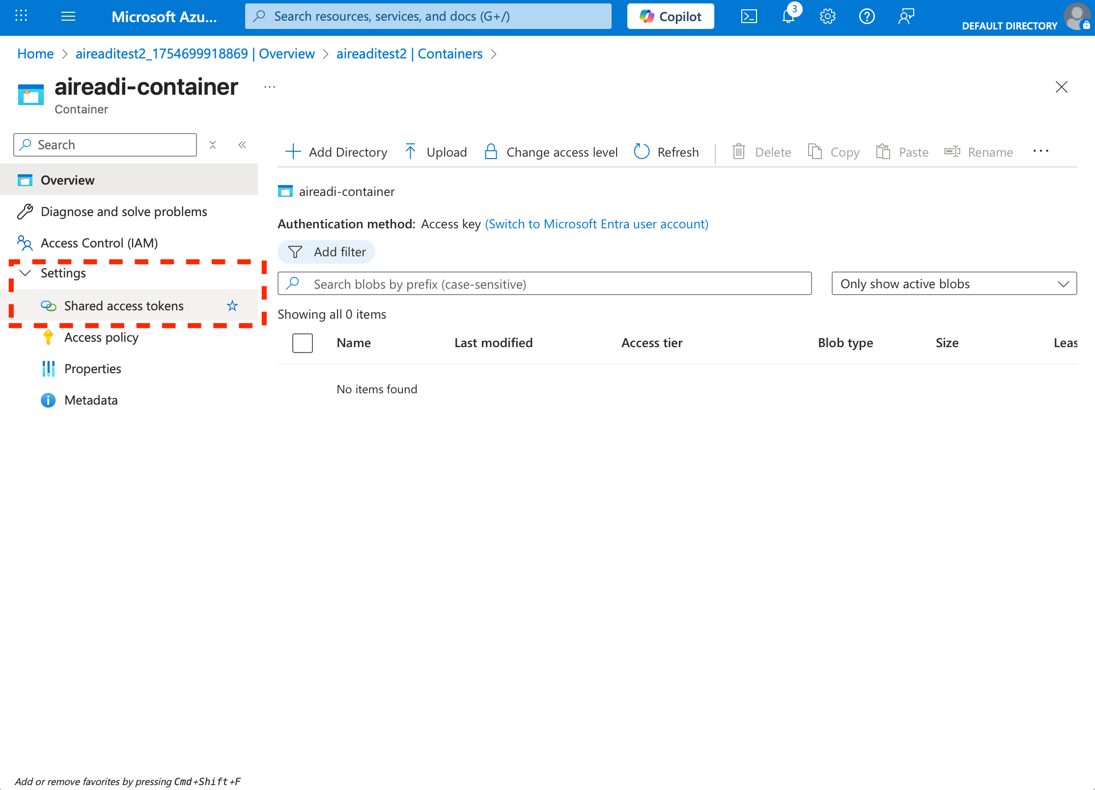 From the container, expand the "Settings" menu item and select "Shared access tokens".