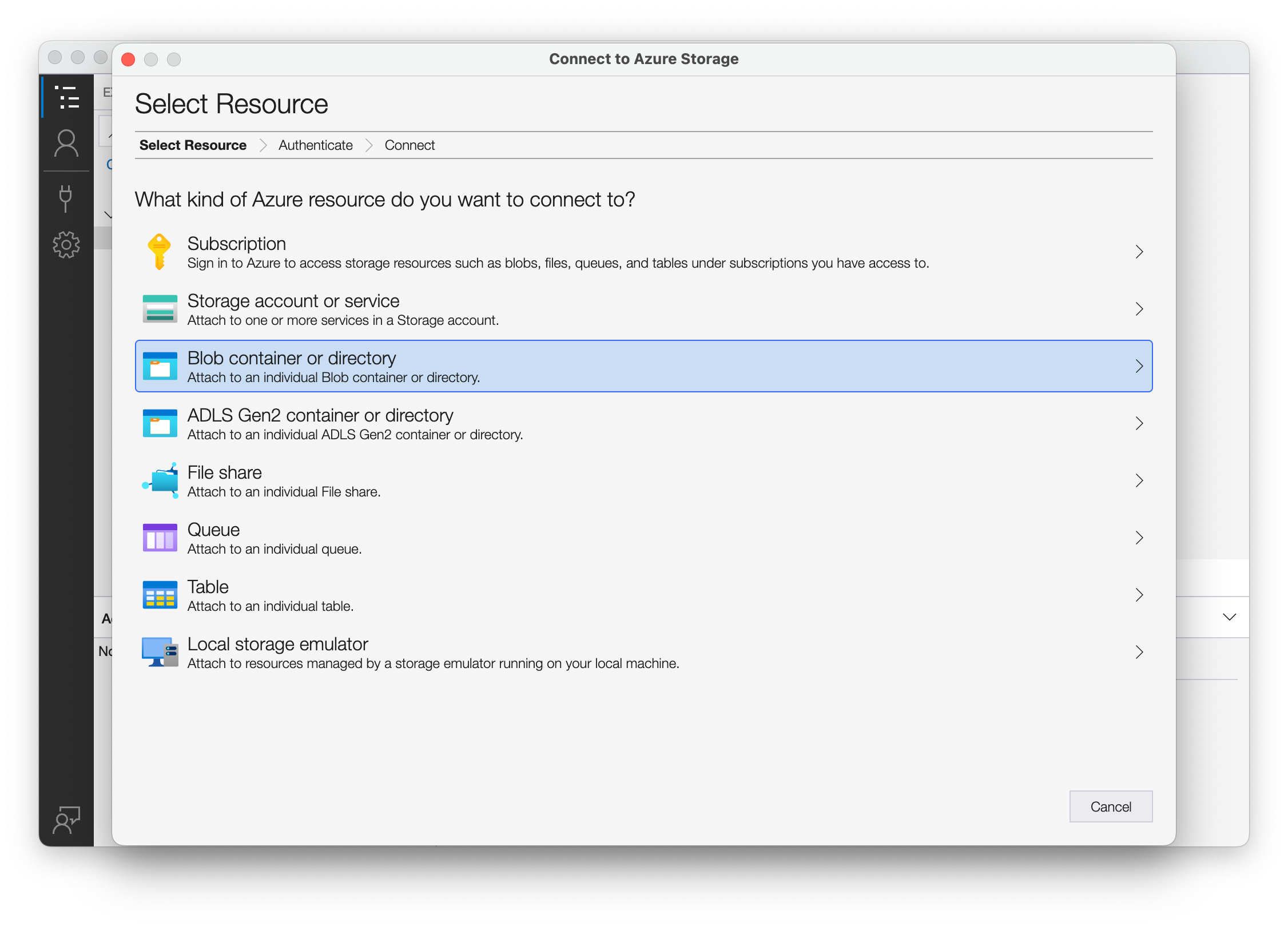Click "Connect to Azure Storage ..." to select your storage resource.
