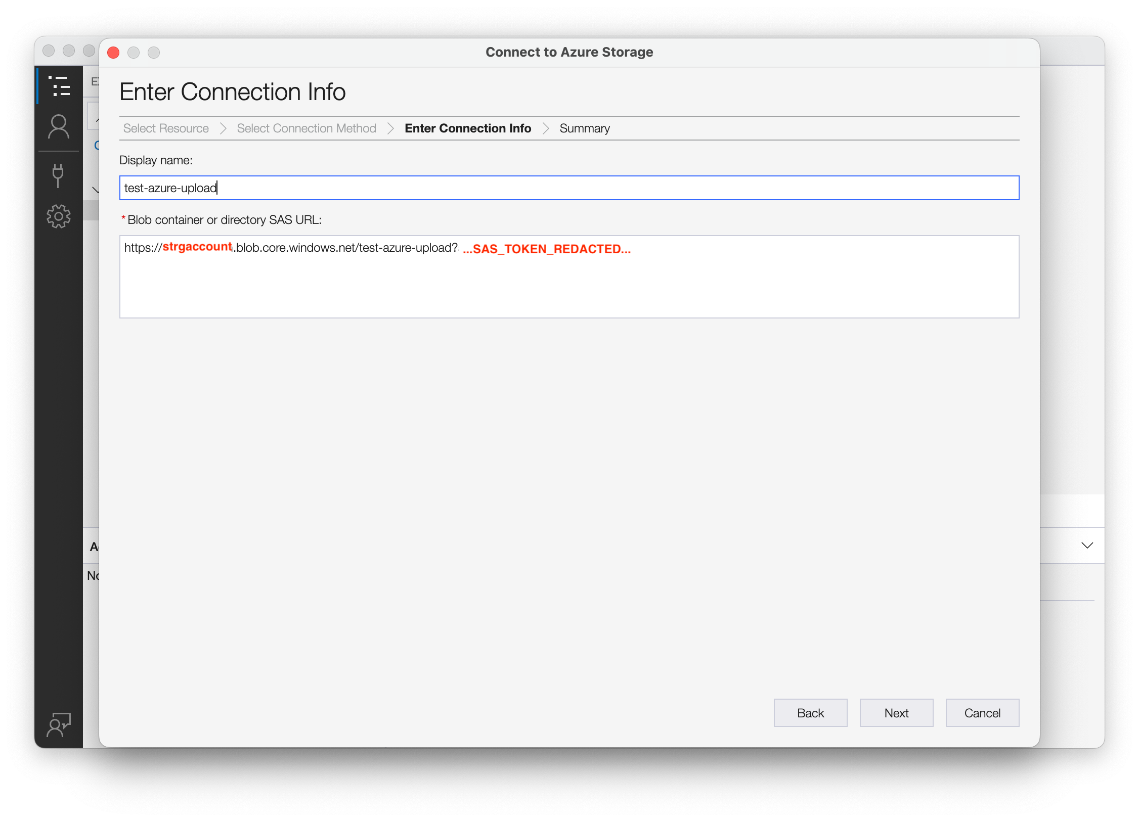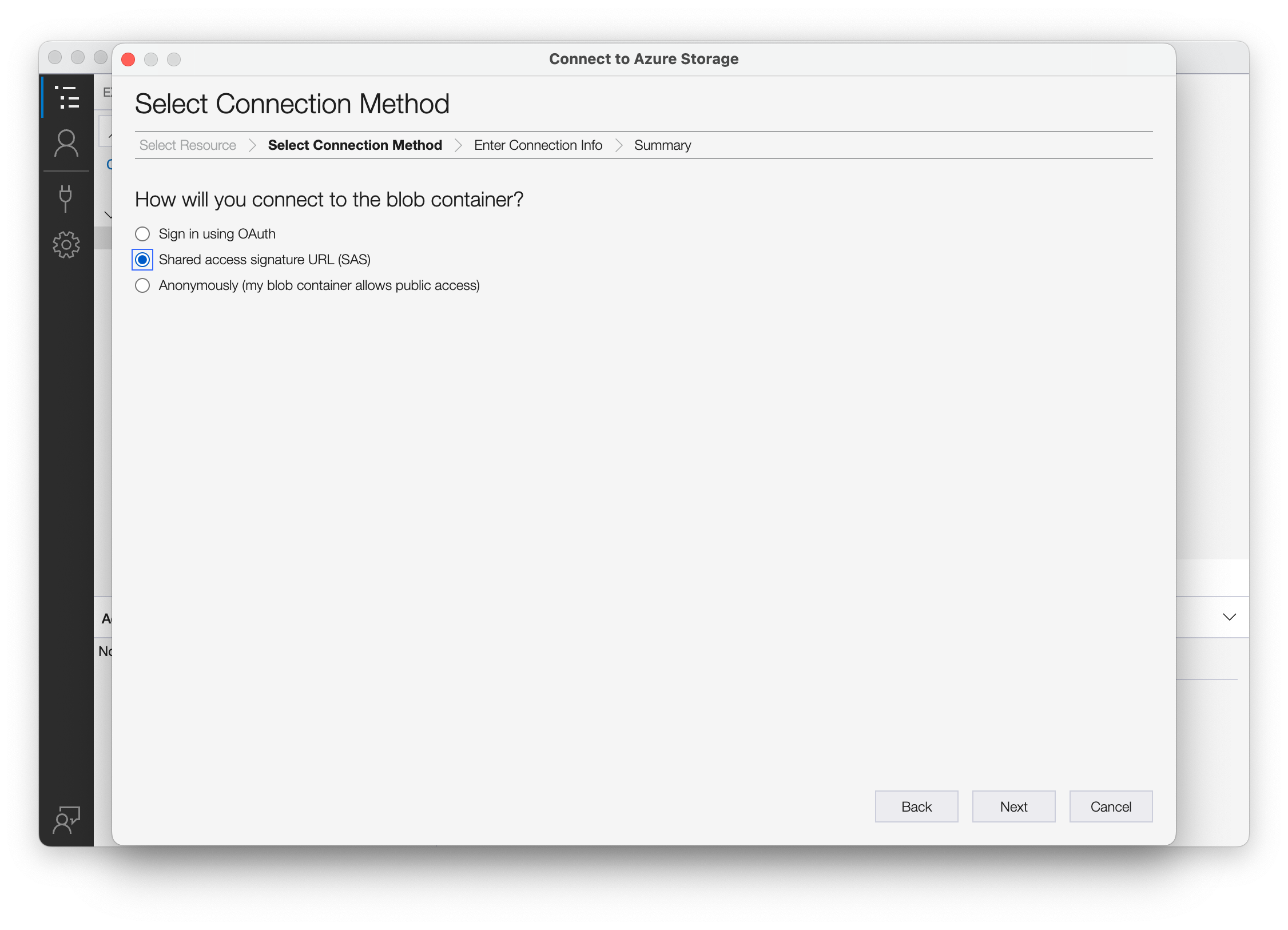 Choose the Shared access signature URL (SAS) connection option.